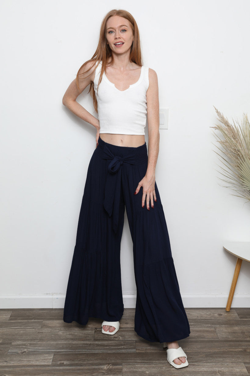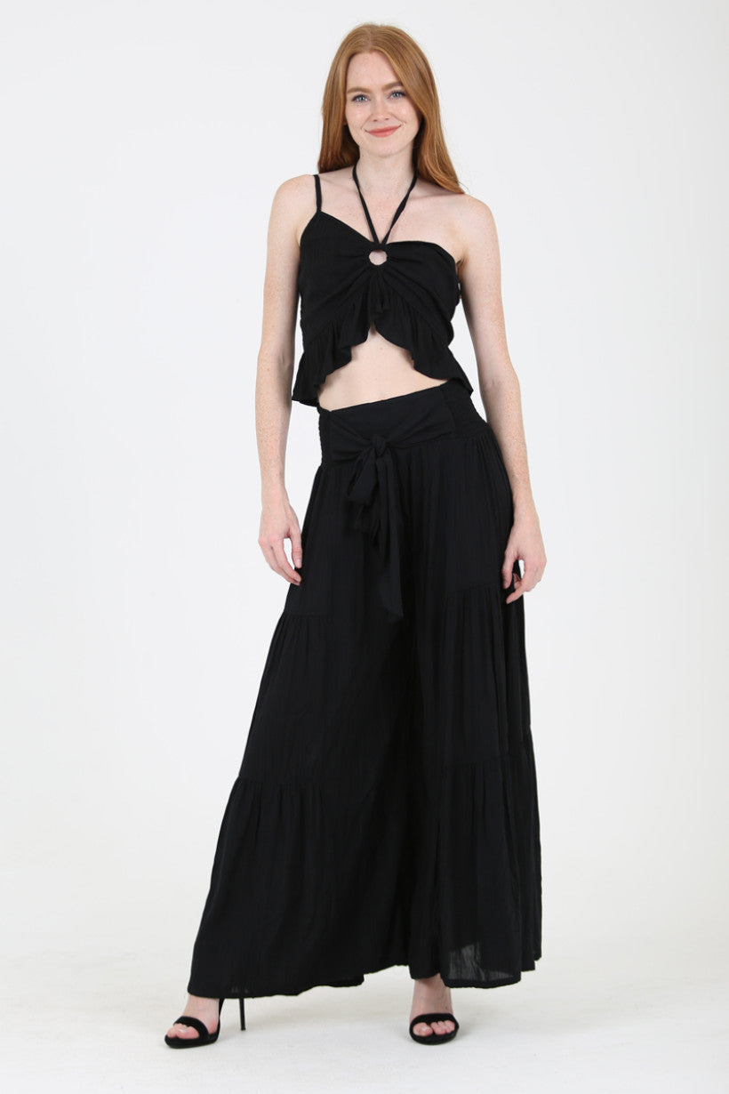 Lennox Comfort Tie Elastic Waist Tiered Wide Leg Black Pant
