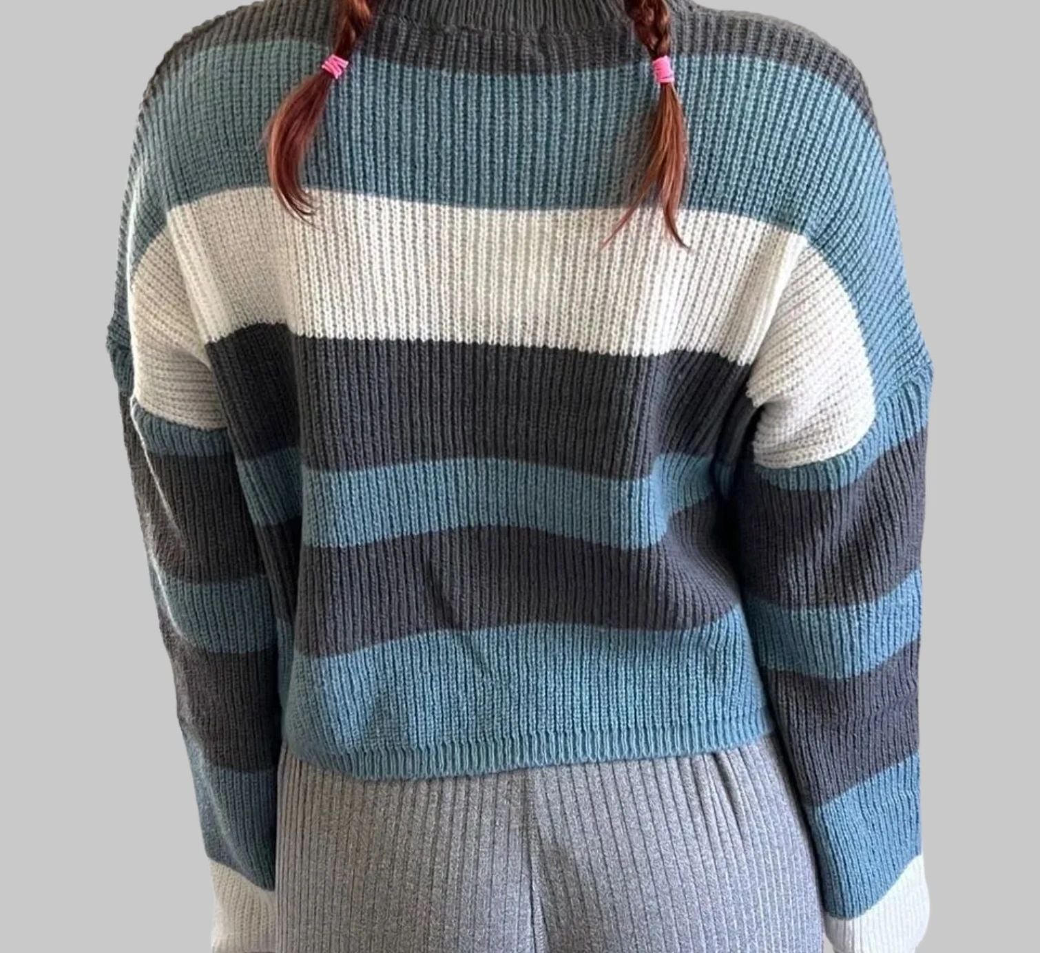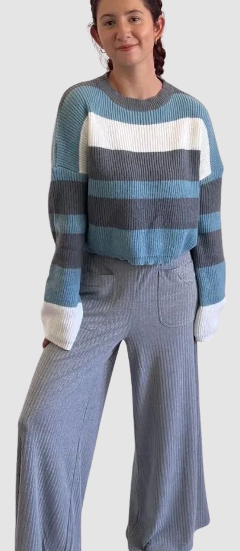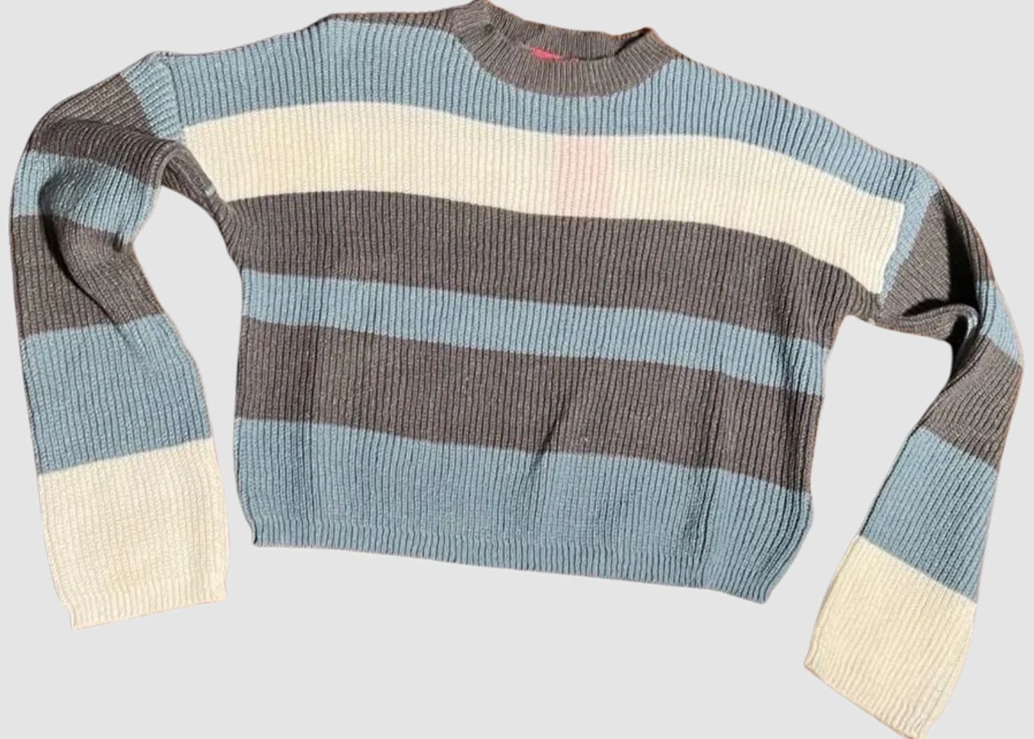 Blue Grey White Color Block Cropped Sweater. This comfortable, soft cropped cable knit crew neck sweater has a beachy vibe and goes well with almost any bottom. It is a great value and well made. It has long sleeves and will keep you warm in winter. It is great for layering. It is also a great transitional piece. This sweater is true to size and comes in Small, Medium, Large and Extra Large. FINAL SALE