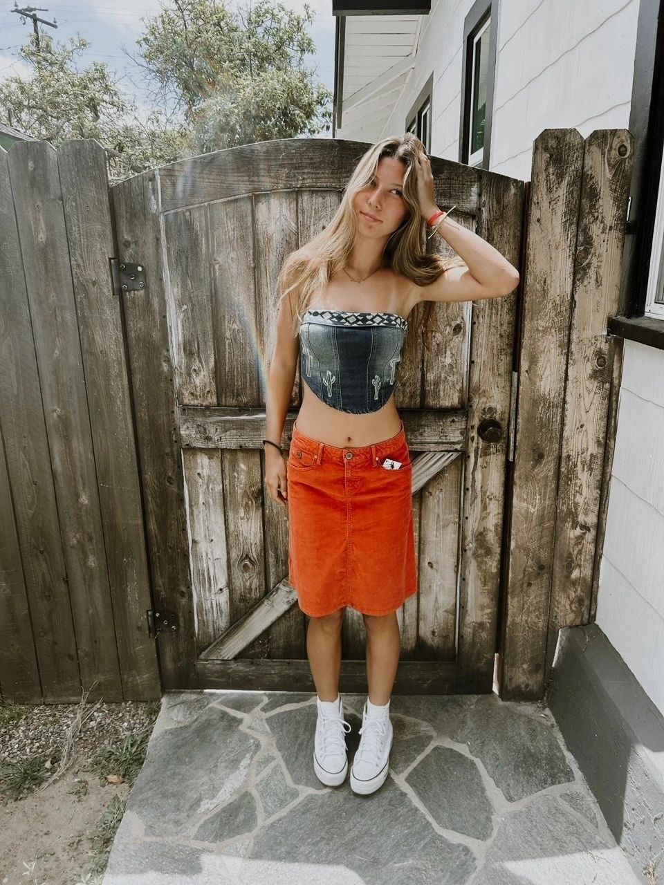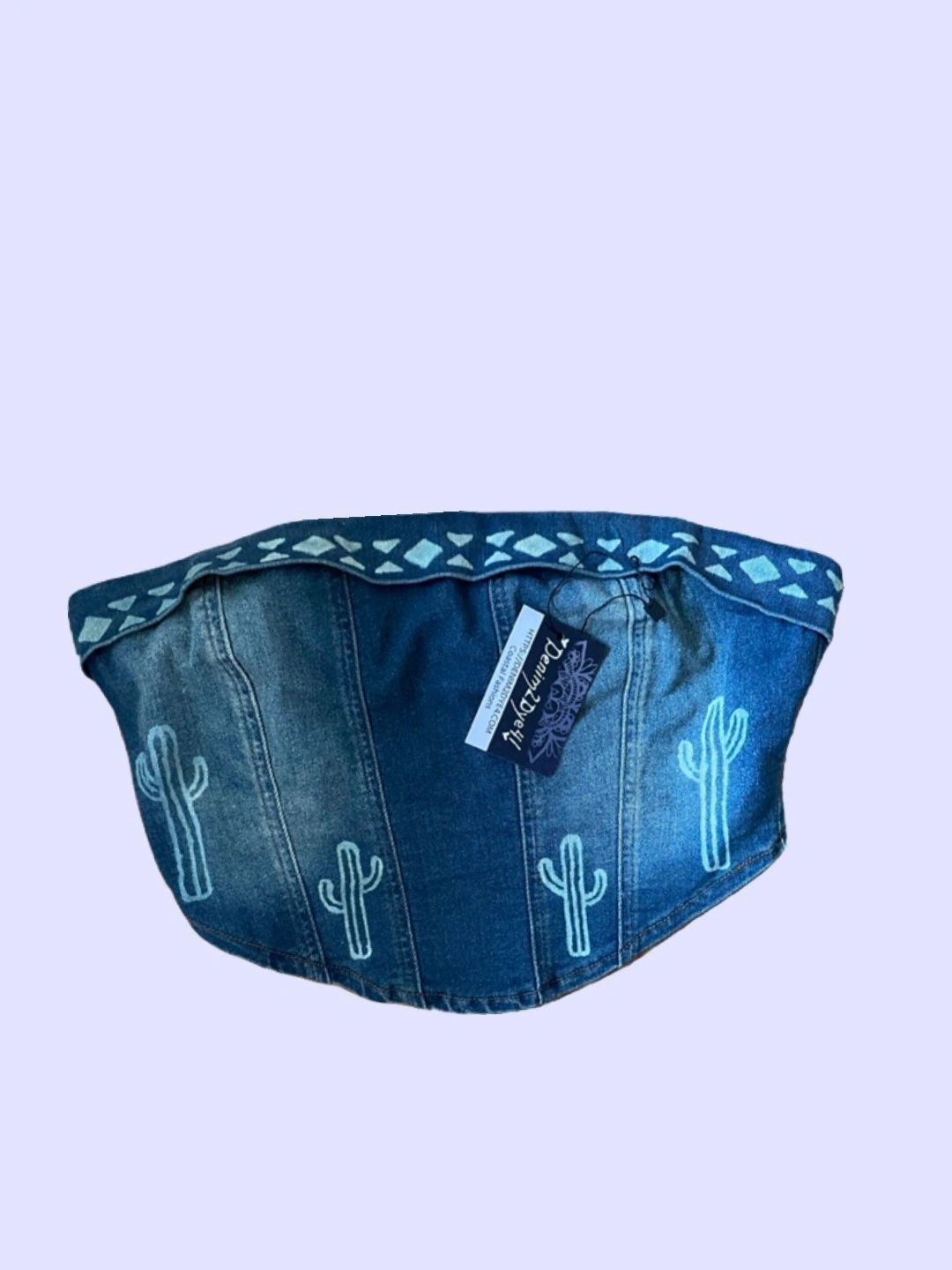 Color distressed corset strapless top. Zip back, hand dyed cactuses and southwestern detail on top fold. This item is new.