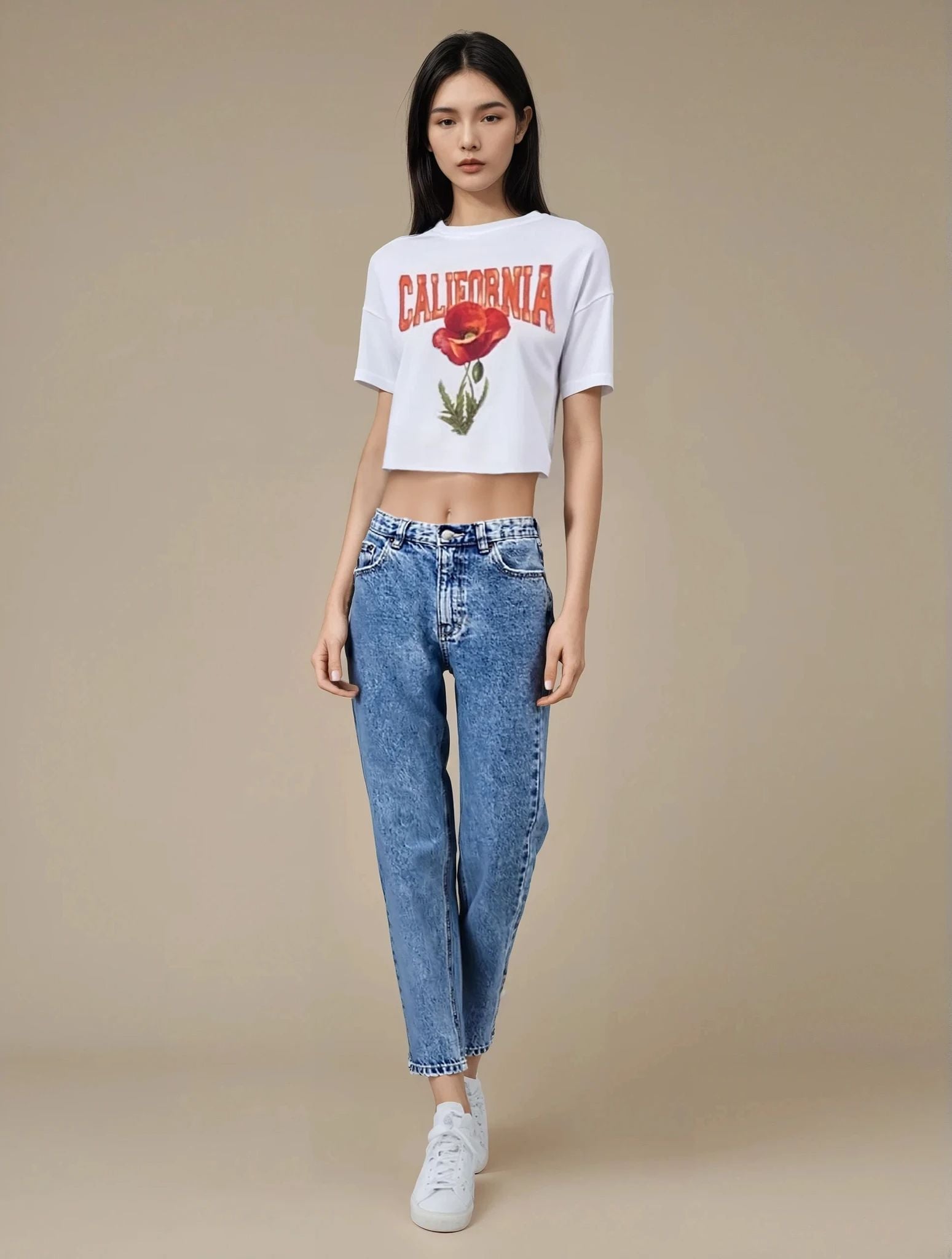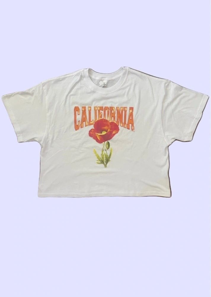 Super soft long cropped white t-shirt with orange text spelling "California" with poppy flower in red, orange and yellow.