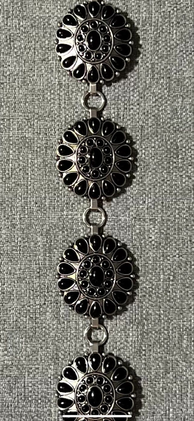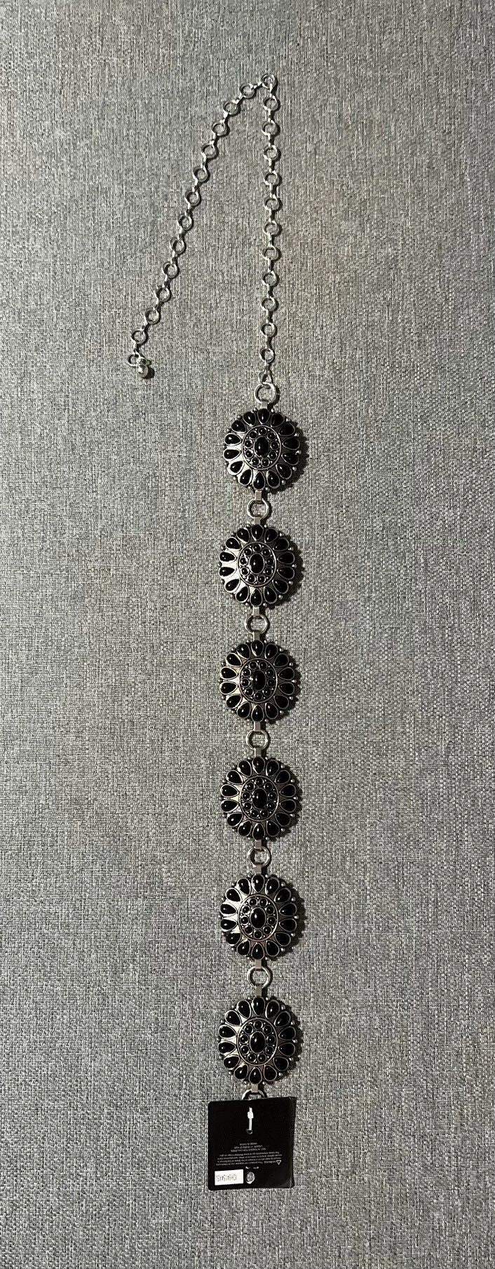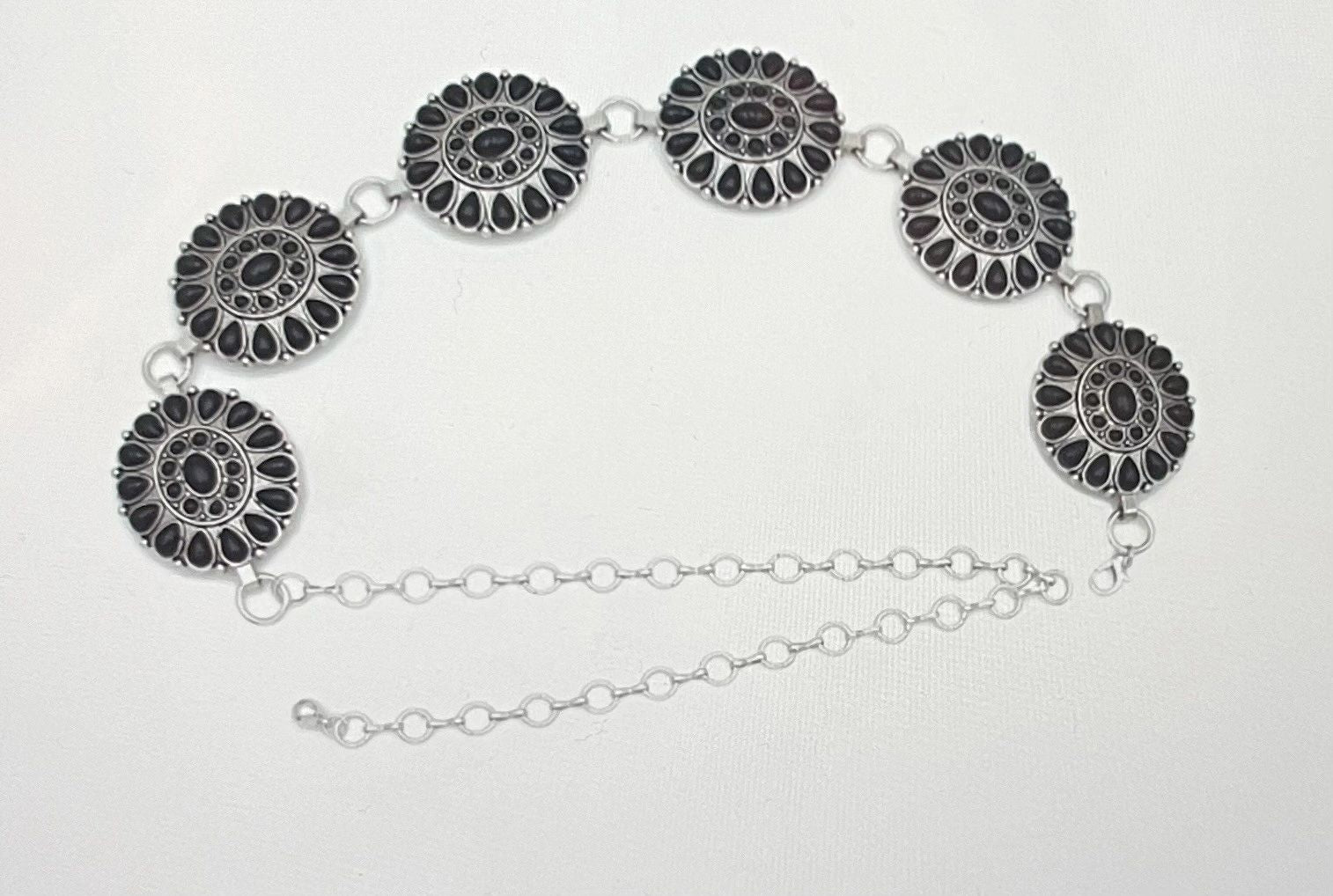Introducing our exquisite Concho Chain Belt with Black Stones, a captivating accessory that effortlessly enhances your style.
