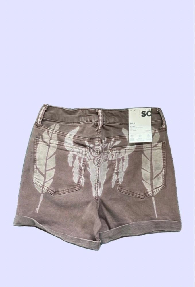 Faded brown high rise midi shorts with hand dyed floral cow skull and feathers.Southwestern theme.