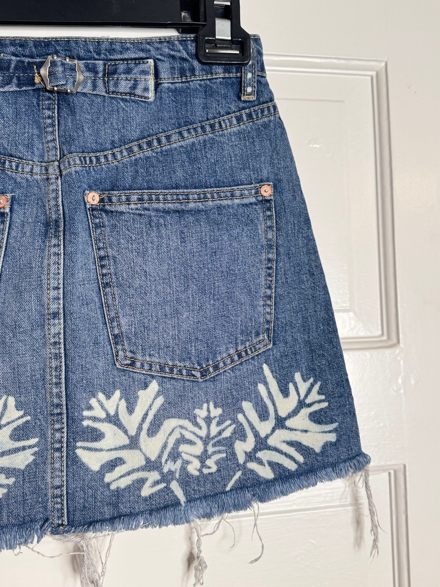 This raw hem Mini skirt has a trendy hand bleached leaf pattern and comes in a size 0 / 25. It is a one of a kind repurposed skirt. There are hand bleached leaves on the front and back hem as well as on the front pockets. Made from denim, this skirt is durable and easy to care for with cold machine or hand wash. This is a repurposed item.