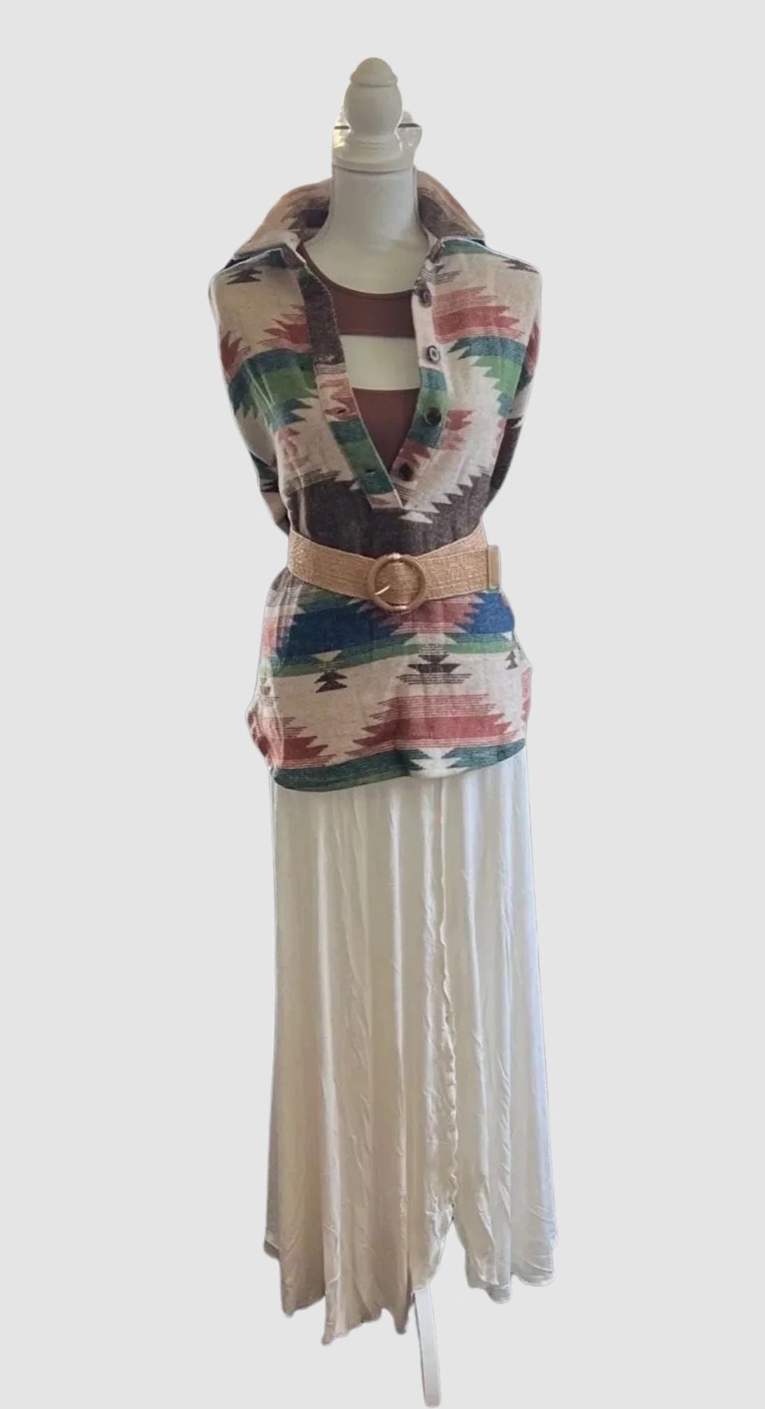 This is a great stand alone piece with Shorts, a skirt or jeans. We layered it under our Western Pullover Shacket and with the High Low Peek a Boo Maxi Skirt and Boots.