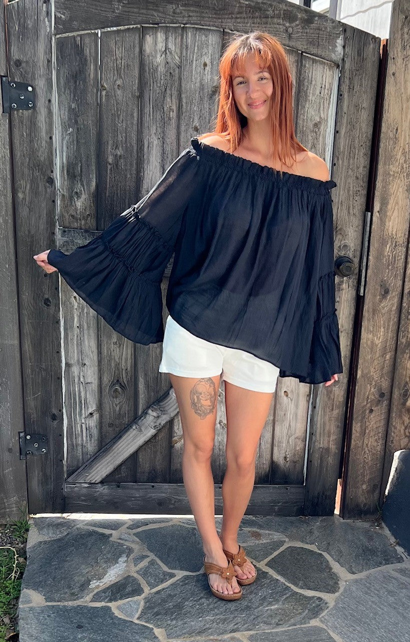 Soft, sheer, and made to move with you—the Moonlit Muse Off-Shoulder Top blends romantic detail with everyday ease. Crafted from airy, lightweight fabric, this blouse features tiered bell sleeves and a relaxed silhouette that flows effortlessly. The elastic neckline allows for on- or off-shoulder styling, giving you a look that’s as versatile as it is dreamy.