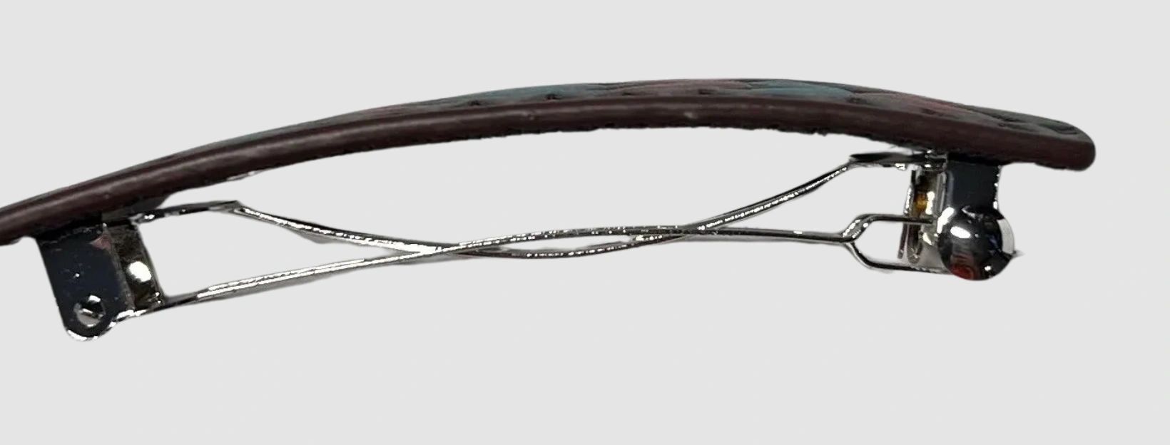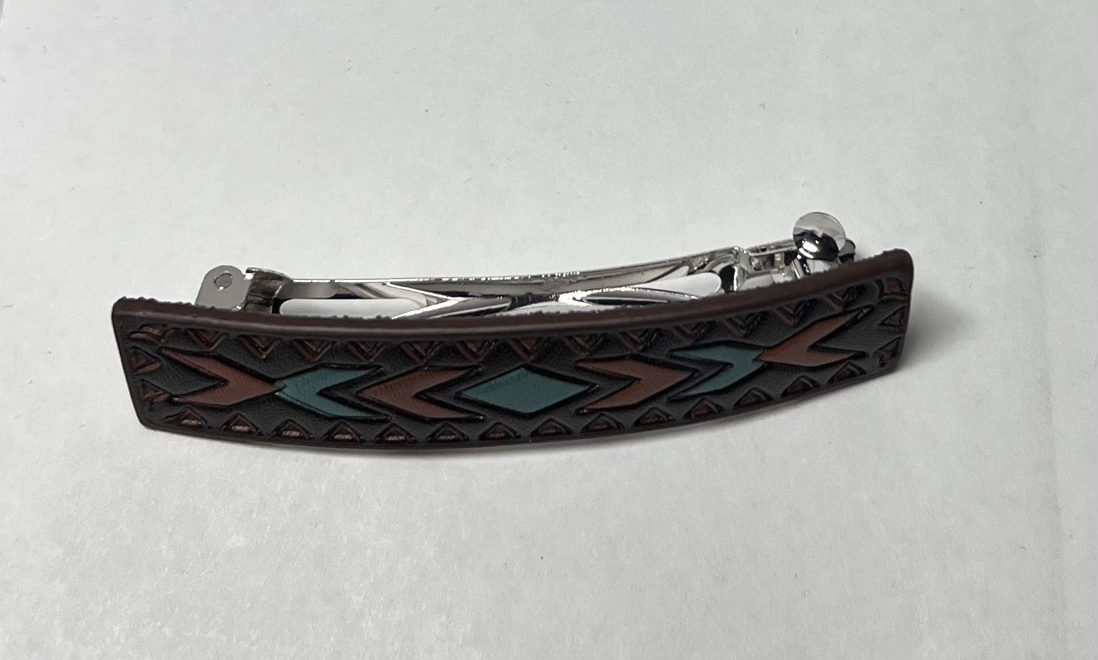 Introducing our Southwestern Geometric Leather Barrette! This trendy accessory features a beautiful color palate of browns and turquoise design. Add the perfect touch of country into your outfit. One size. Genuine Tooled Leather. Limited quantity. One size.