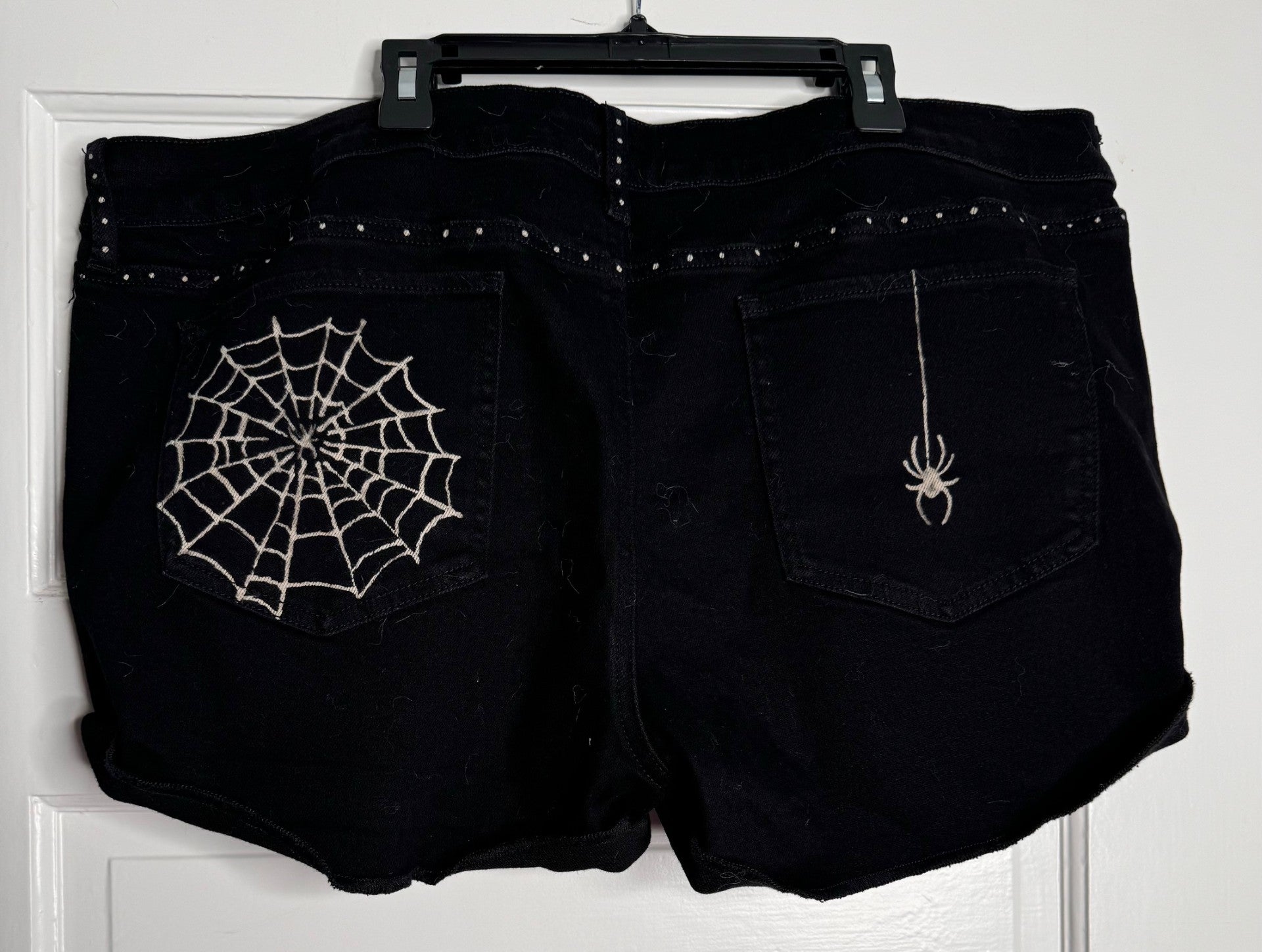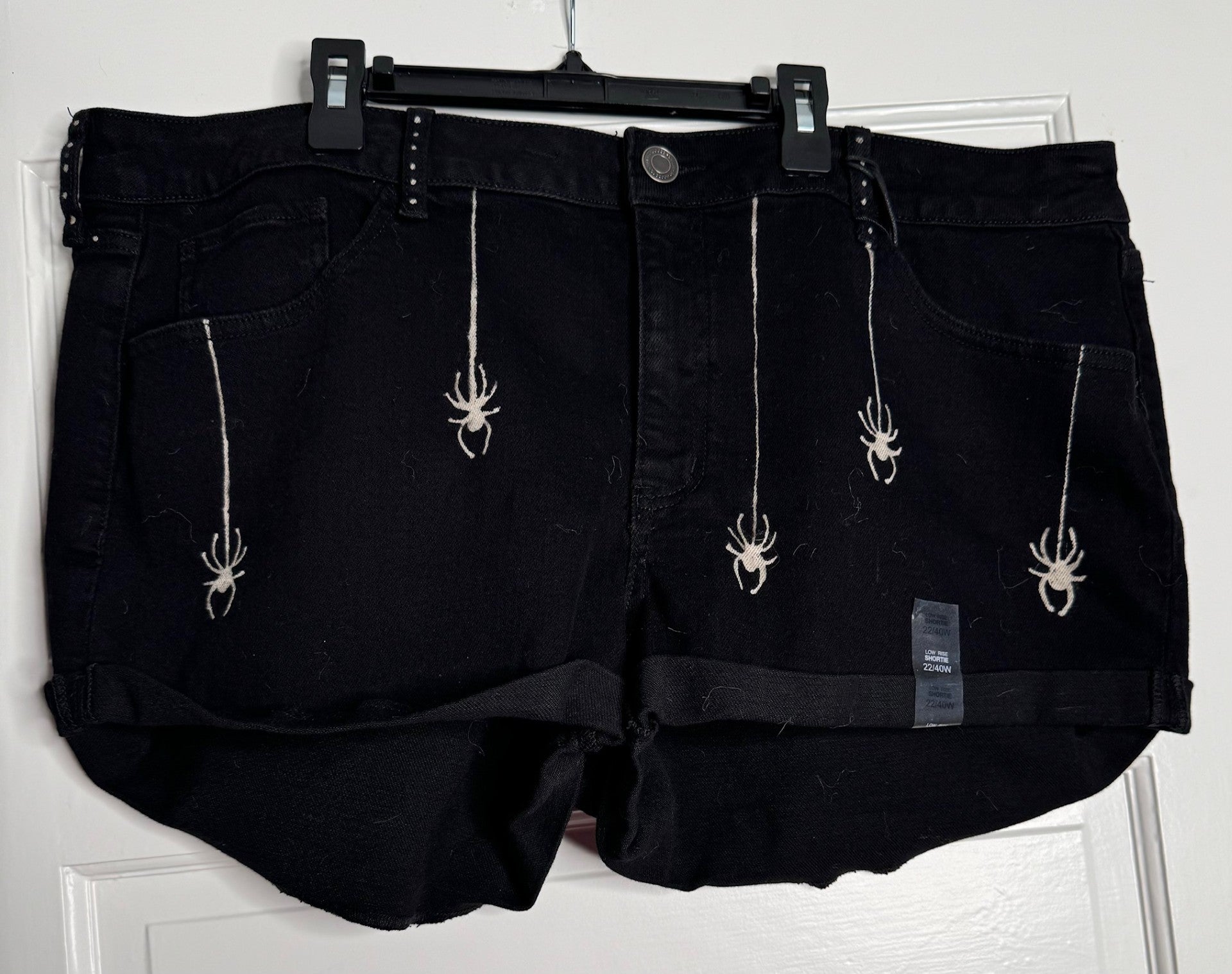 Get caught in the web of fashion with these Spider Hand Bleached Shorts. They feature a unique web and spider design on black fabric with a front zip and button closure. This is a High Rise Mom Short. The hand bleached spider web design adds an edgy touch. Perfect for the month of October and beyond. Cuffed hem, spooky style. This is a new Item with Tags.