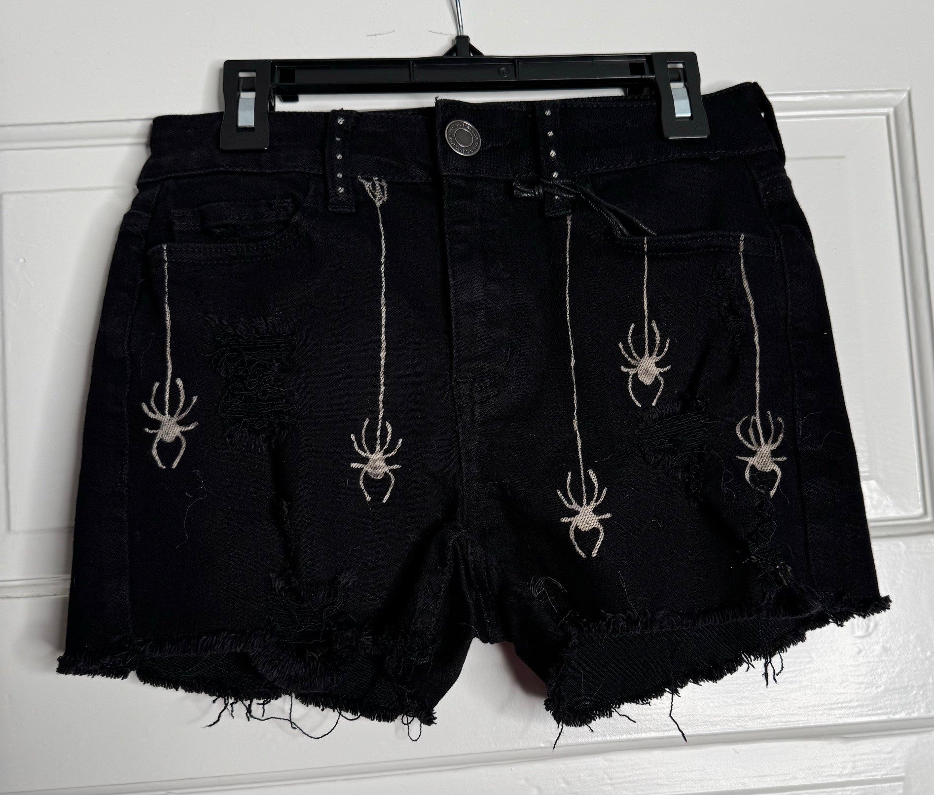 Get caught in the web of fashion with these Spider Hand Bleached Shorts. They feature a unique spider and web design on black denim fabric with a front zip and button closure. This is a High Rise distressed shortie short. The hand bleached spider web design adds an edgy touch. Perfect for the month of October and beyond. Raw hem, spooky style. This is a new Item with Tags.