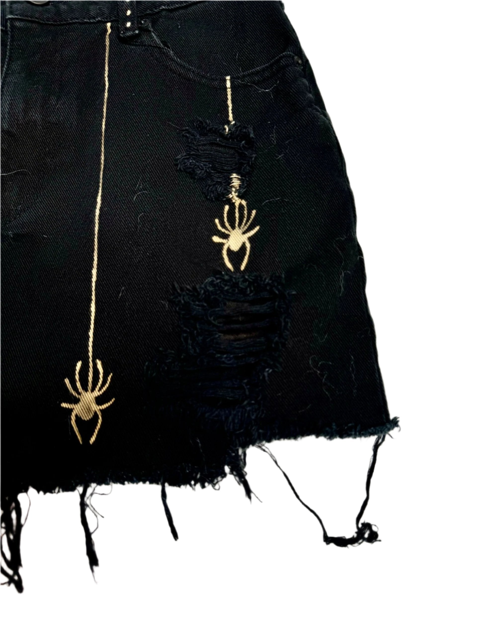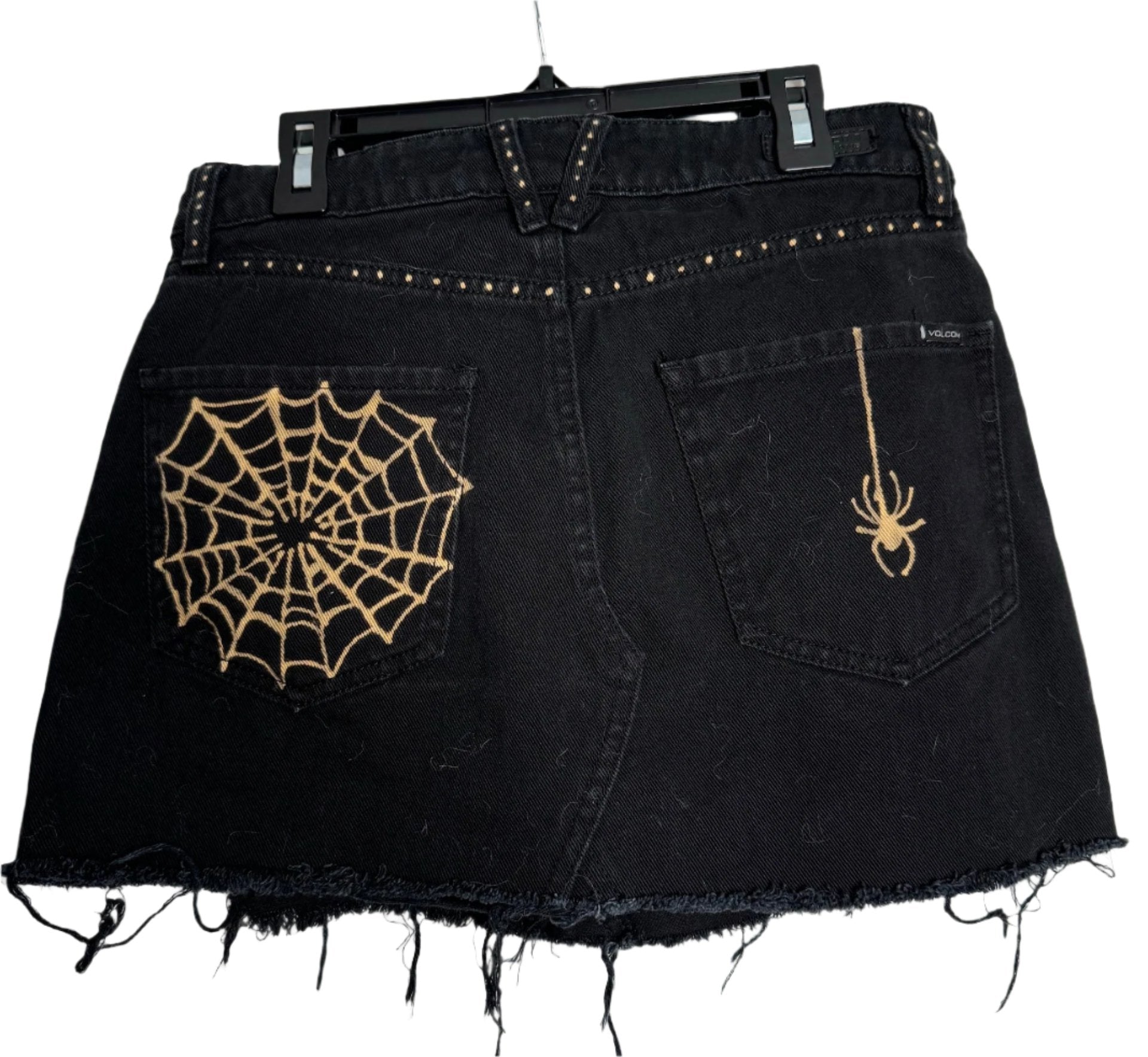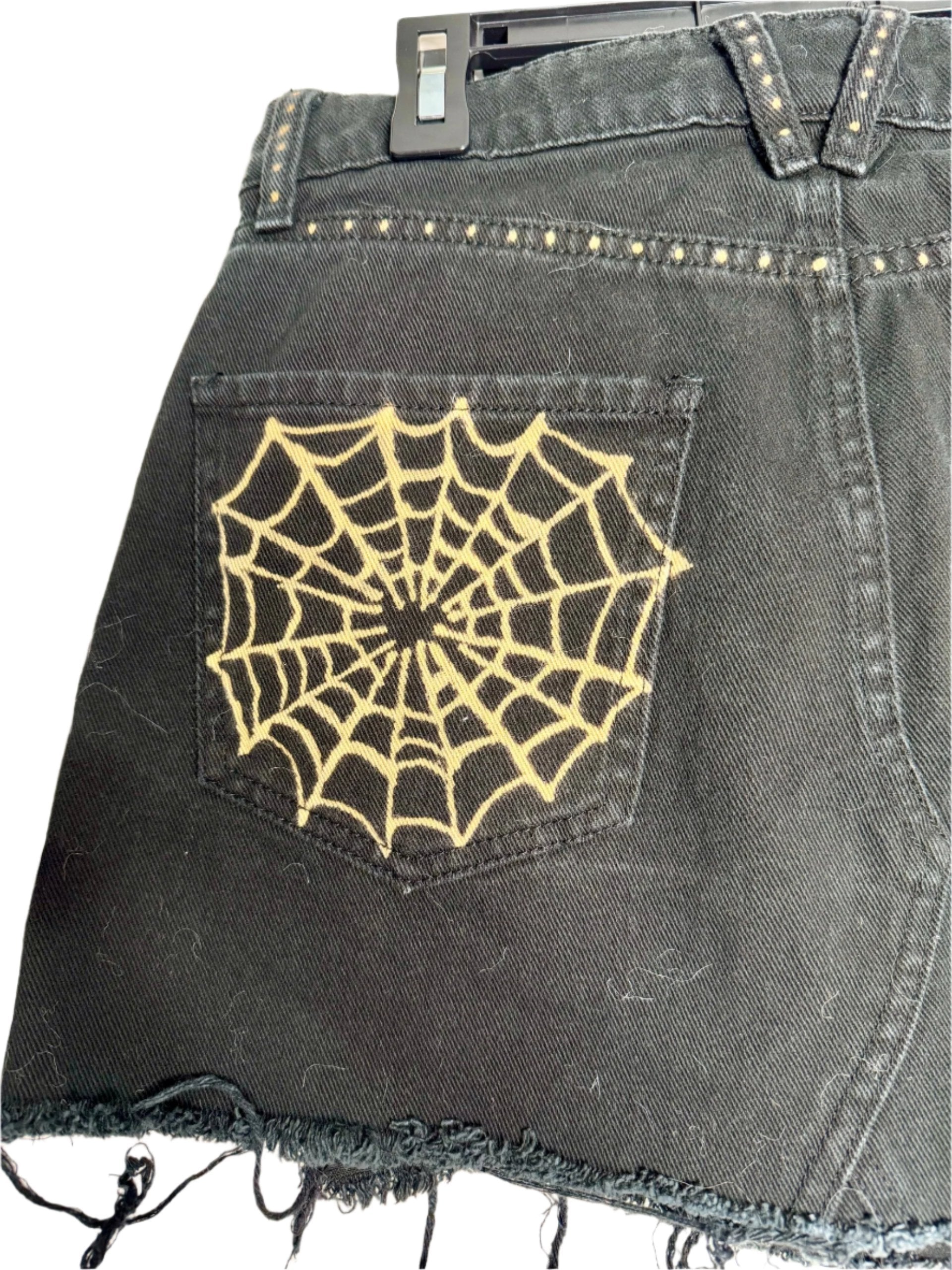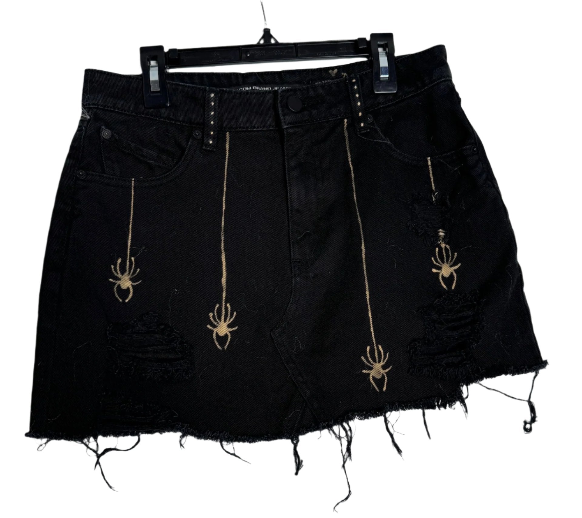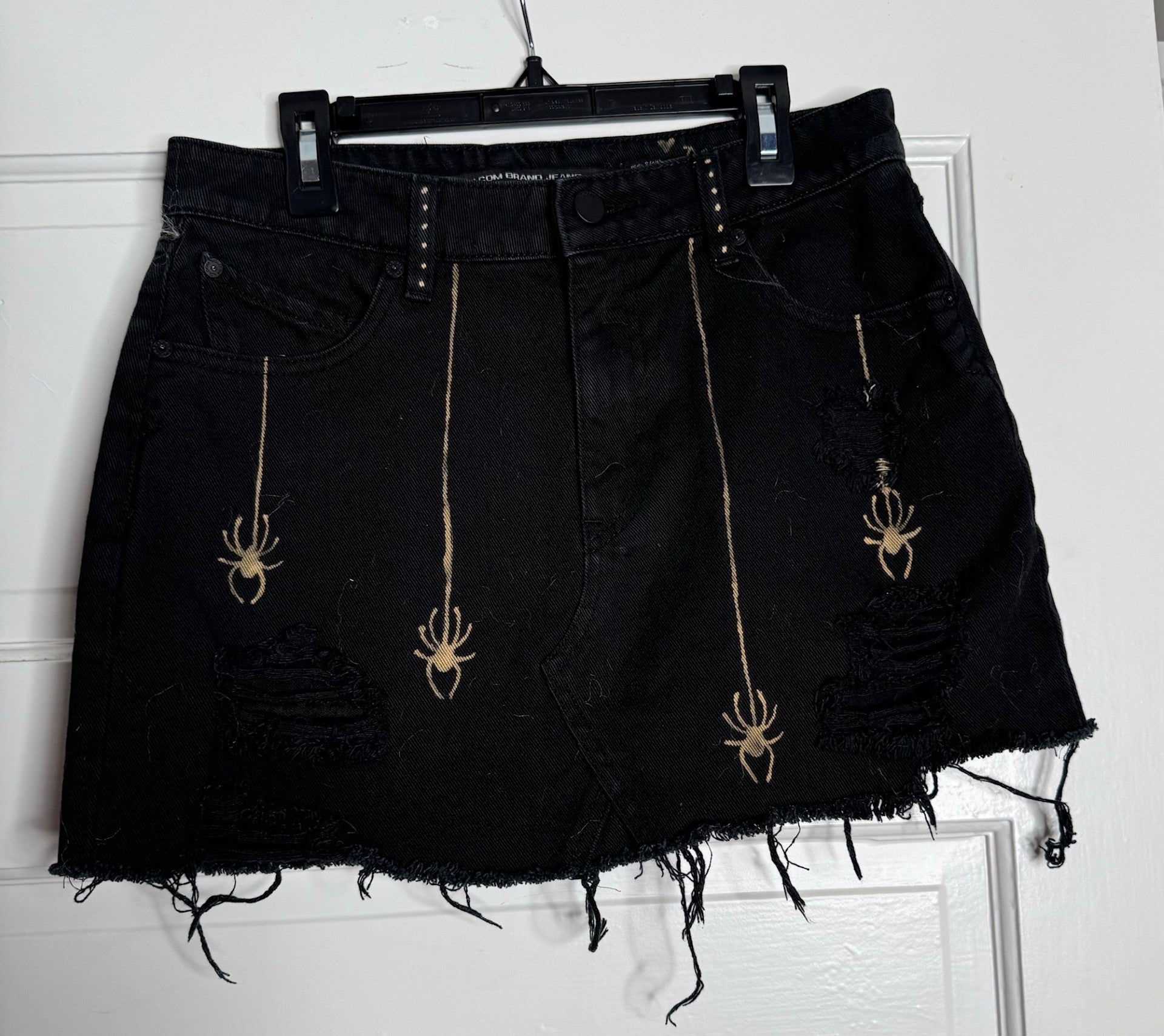 Get caught in the web of fashion with these Spider Hand Bleached skirt. Featuring a unique spider and web design on black with a button zip front closure. This is a High Rise Theskirt. This hand bleached spider web design adds an edgy spooky touch. Perfect for the month of October, Halloween and beyond. This item is repurposed.