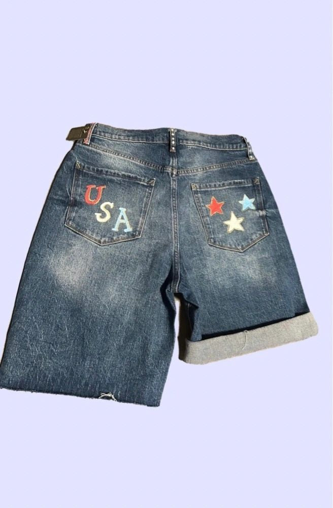 These shorts are perfect for any patriotic occasion, with their eye-catching design featuring white stars on a denim blue background, and the letters "USA" boldly written across them. The shorts are designed to fit comfortably on any woman who wears a size 8.