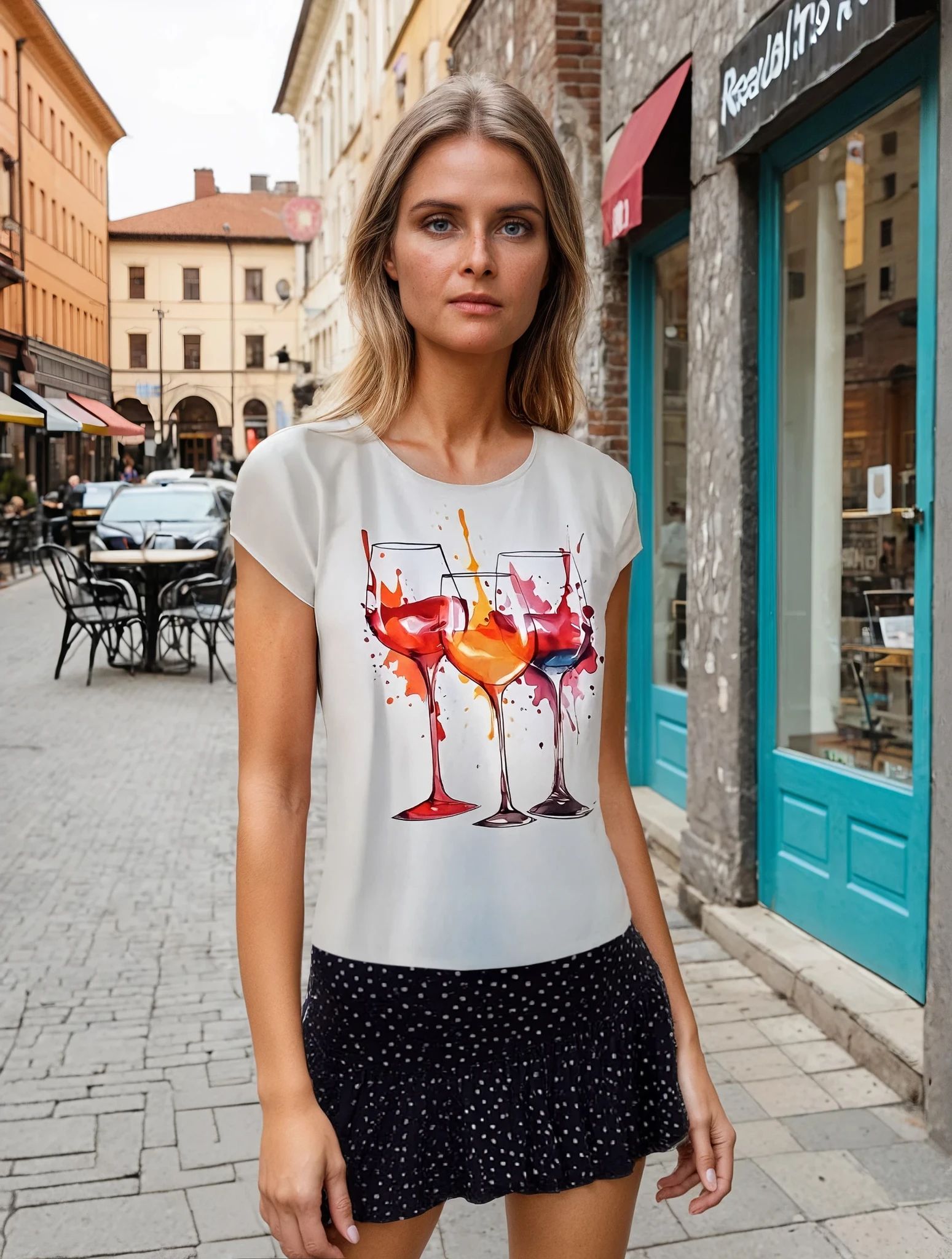 This is our POPULAR Wine Splash Tee Shirt featuring a colorful design.